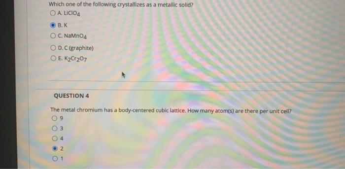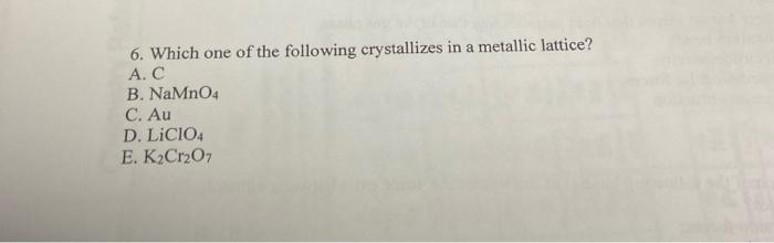 Which crystallizes in a metallic latticeNaMnO4KCLiClO4K2Cr2O7 Get 15 discount on your first 3 orders with us Use the following coupon FIRST15 Order Now. Any packing of spheres leaves out voids in the lattice. Which one of the following crystallizes in a metalliclatticeCNaMnO4KLiClO4K2Cr2O7I think metallic.