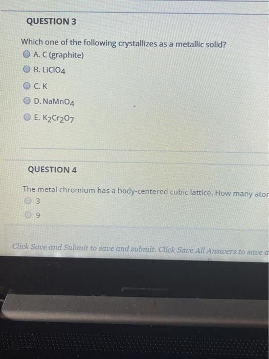 A certain solid metallic element has a density 787 gcm3 and a molar mass of 5585 gmol. Na2Cr2O7 KMnO4 Si LICIO3 Rb. GENERAL CHEMISTRY 1 TOPIC 11 TEST Which one of the following crystallizes in a metallic lattice.